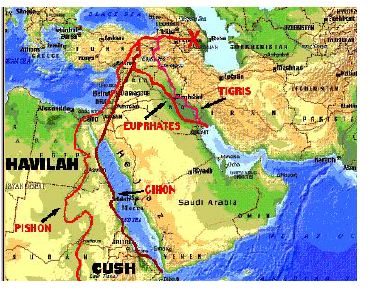 FourRivers(l)Search the internet and you will find gobs of suggestions and goofy maps of where Eden was by trying to identify its four rivers. As the above graphic attests, many have attempted to find the four rivers in Mesopotamia (note that in the above graphic Havilah is in the wrong place, which we will discuss shortly). However, there is only geological evidence of the Tigris and the Euphrates (the Hiddekel and the Pherat are their names in the Hebrew) existing there. Ignoring this fact, some have said that Eden must have been where the Tigris and Euphrates meet at the Persian Gulf. However, they also ignore that the Tigris and the Euphrates flow into one delta, not from the delta into two rivers as Genesis describes. The Tigris and the Euphrates flow the opposite way this interpretation suggests.